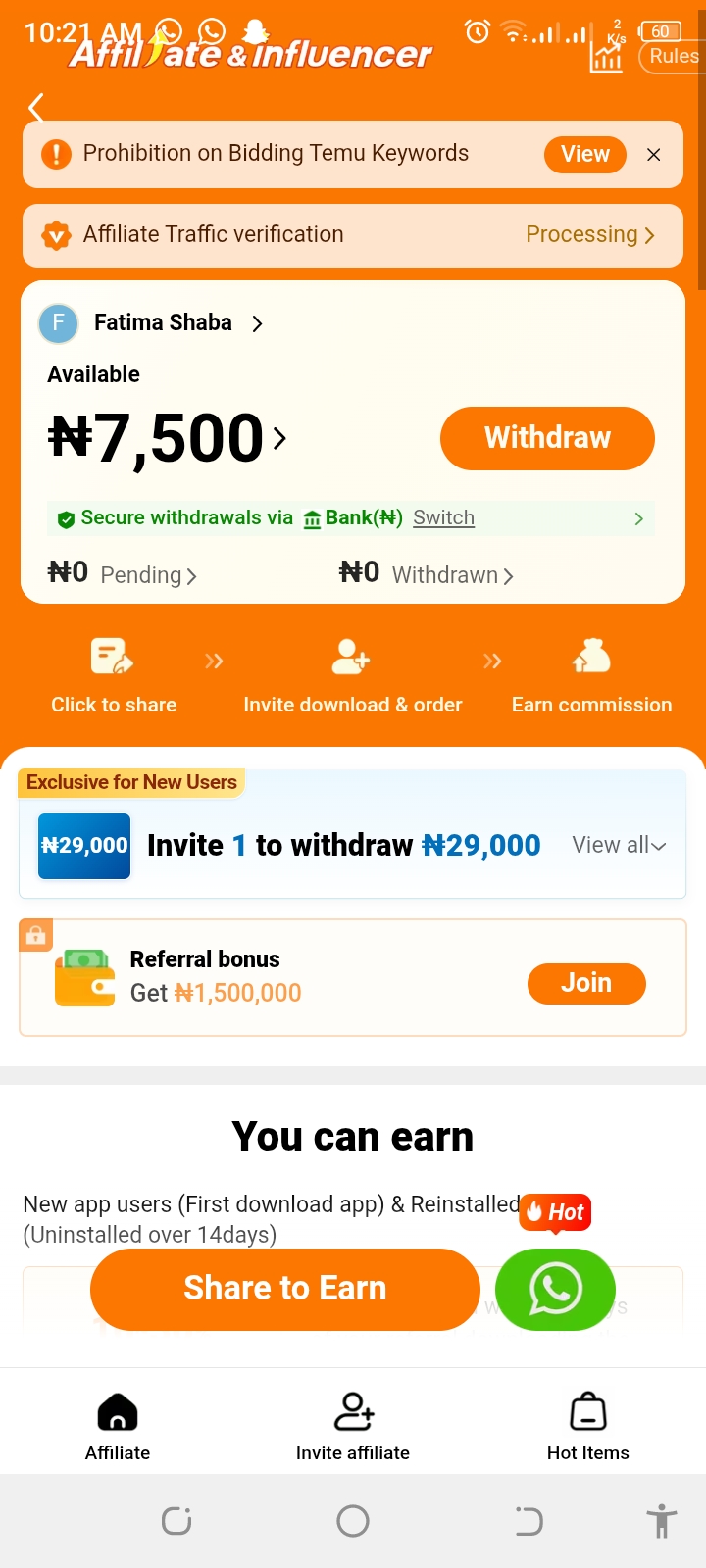 Temu’s pumping bonuses: up to $12 per new download, 10-30% commissions (Nigeria affiliates report 30% tier; seasonal pushes hit 20%+), and monthly cash rewards for top referrers. The dashboard is brutally simple — clicks, sales, cash-out.