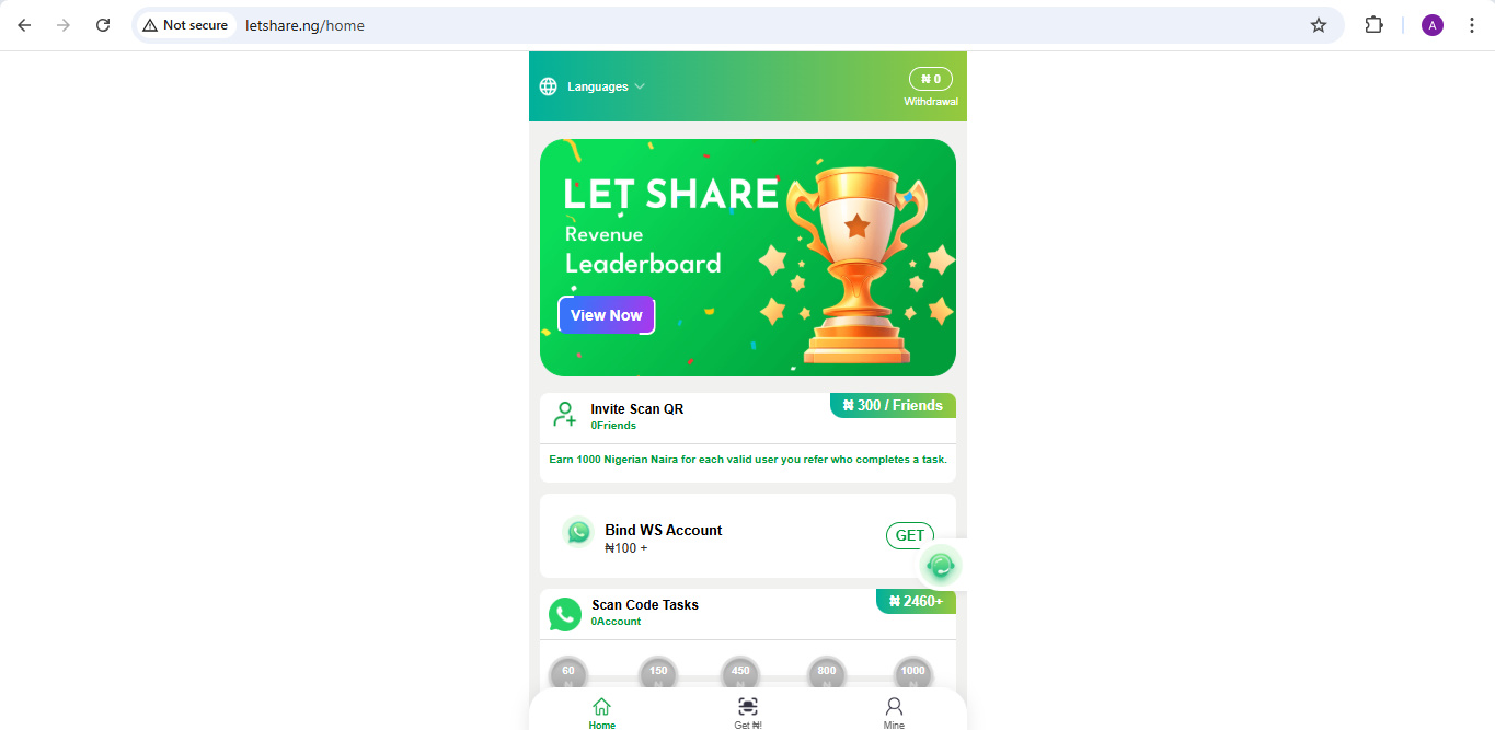 Letshare.ng is a newly launched WhatsApp task earning platform that claims to pay users for connecting (or “binding”) their WhatsApp accounts. The site also offers referral bonuses for bringing in new members.